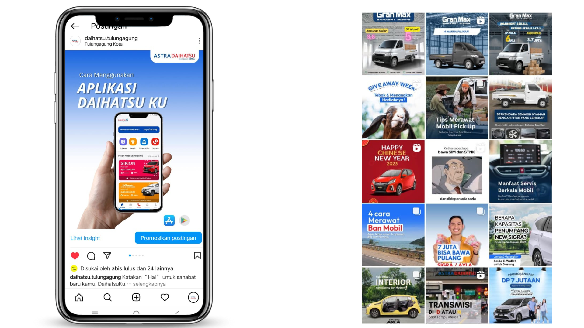 My team and I create daily content in the form of graphics, images, videos and carousels for Astra Daihatsu Tulungagung which are distributed via the Instagram, Facebook and Tiktok platforms.