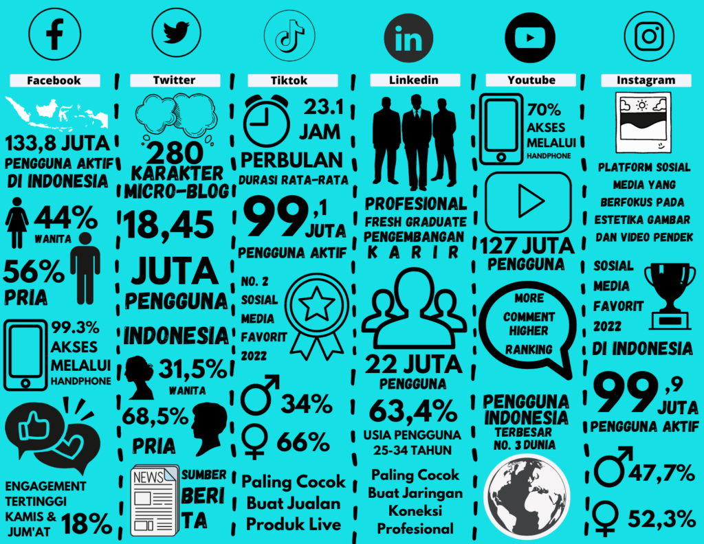 Sebuah perencanaan yang baik diperlukan dalam pemasaran Omni Channel demi tercapainya suatu efektivitas dari pemasaran tersebut. Adapun dalam aktivitas merencanakannya tentu saja dibutuhkan sebuah panduan mengenai karakteristik dari masing-masing channel sosial media, agar strategi yang di jalankan bisa efektif dan efisien menjangkau sasaran yang kita tuju. Melalui postingan ini saya coba untuk menjabarkan beberapa karakteristik khas dari berbagai sosial media yaitu Facebook, Twitter, Tiktok, Linkedin, Youtube dan Instagram.