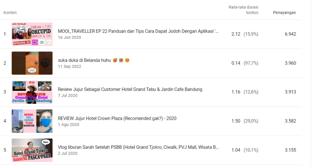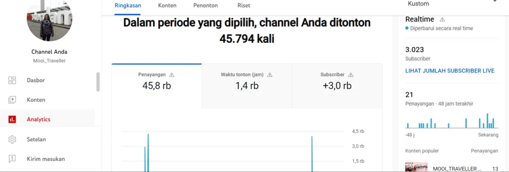 As long as I manage the channel, you can see the results below that the channel has 3,023 organic subscribers with a total of 45.8 thousand views and also 1.4 thousand broadcast hours have been achieved.